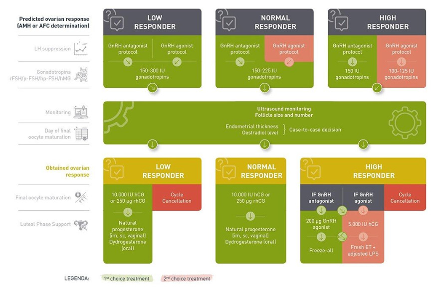 The European Society of Human Reproduction and Embryology (ESHRE) published a guideline on choosing IVF stimulation protocol based on whether the patient is a low responder, normal responder, or high responder based on AMH and antral follicle count and others (Hum Reprod Open. 2020 May 1;2020(2):hoaa009. doi: 10.1093/hropen/hoaa009. eCollection 2020. PMID: 32395637). Its figure is below.
